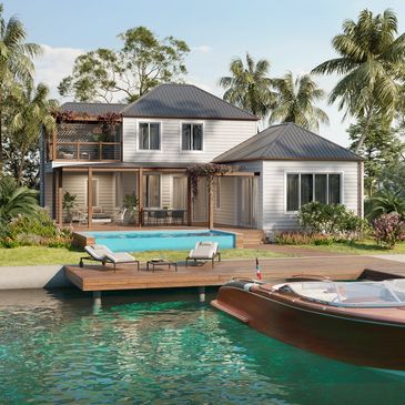 Contemporary villa with a private garden oasis, a pool and private dock.