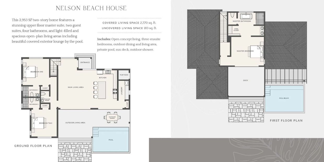 This 2,953 sq. ft. two-story home features a stunning upper floor master suite, two guest suites, four bathrooms, and light-filled and spacious open-plan living areas including beautiful covered exterior lounge by the pool. The villa features open-concept living, outdoor dining and living area, private pool, sundeck and outdoor shower.